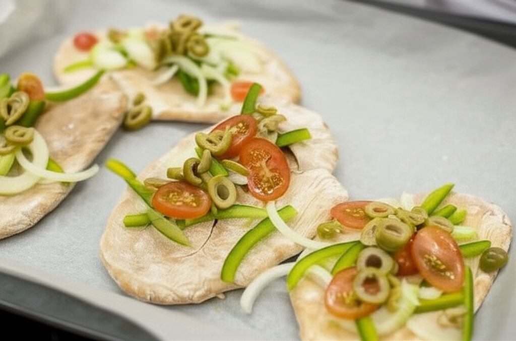 Na każdy placek połóż warzywa, obsyp pociętym szczypiorkiem i oliwkami.
