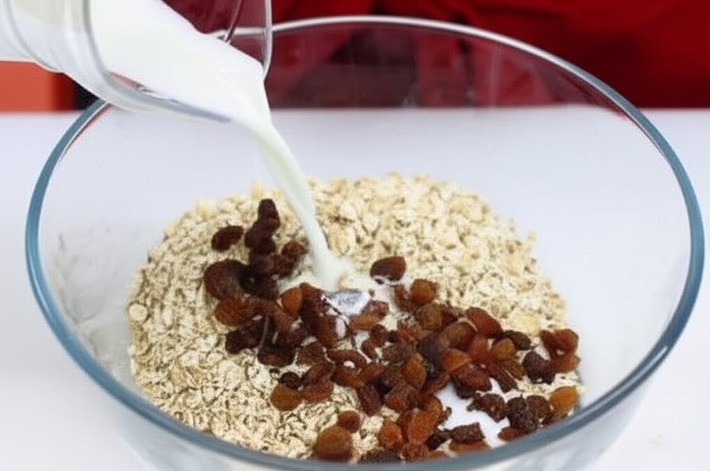 Wymieszaj płatki owsiane z rodzynkami i zalej je mlekiem, aby napęczniały.