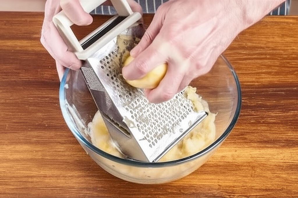 Ziemniaki obierz, opłucz i zetrzyj na średnich lub drobnych oczkach tarki. Przy użyciu gęstego sitka lub gazy wyciśnij nadmiar zbierających się na dnie soków.