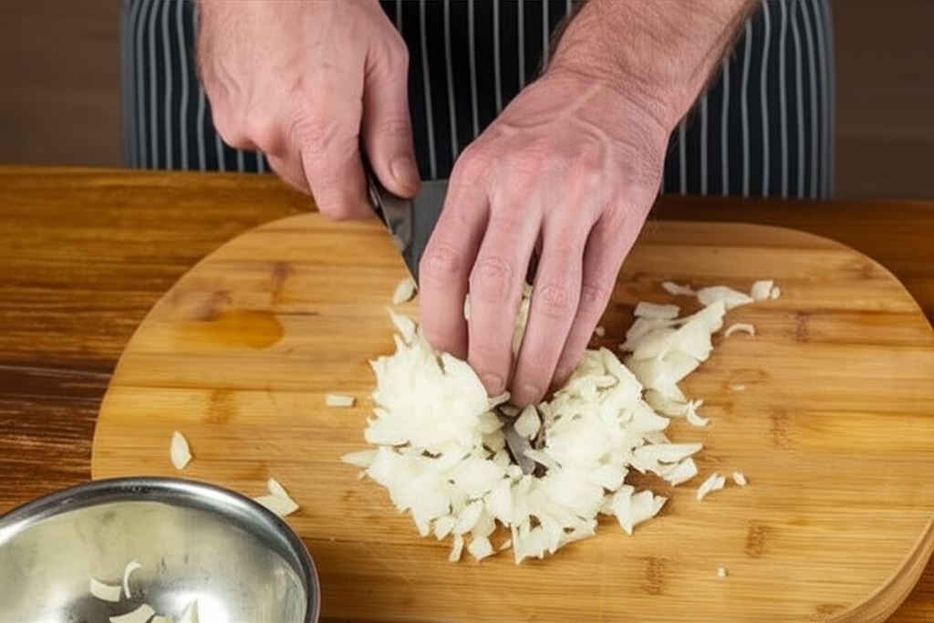 Białą cebulę oczyść ze skórki i dosyć drobno posiekaj.