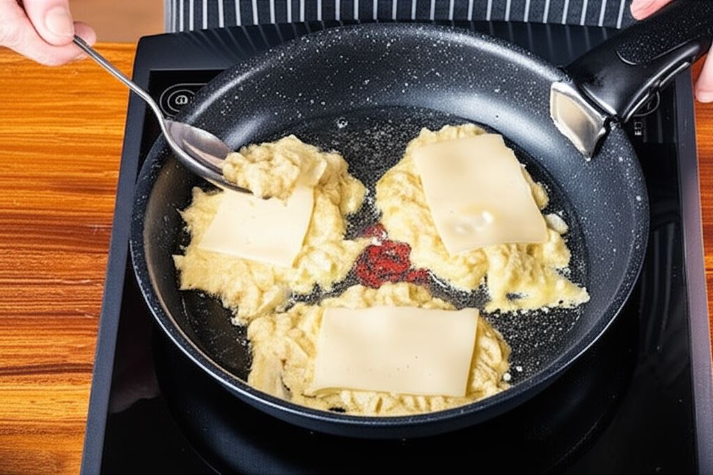 Wlej olej na patelnię z szerokim dnem. Kiedy tłuszcz się rozgrzeje, nakładaj łyżką małe płaskie placuszki, natychmiast umieszczaj na nich plasterek sera i ponownie przykryj cienką warstwą ziemniaczanej masy.