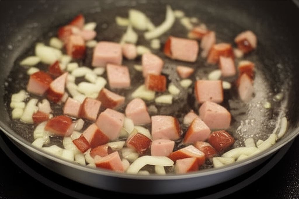 Kiełbasę pokrój na większe kawałki, cebulę na mniejsze i przysmaż składniki na patelni.