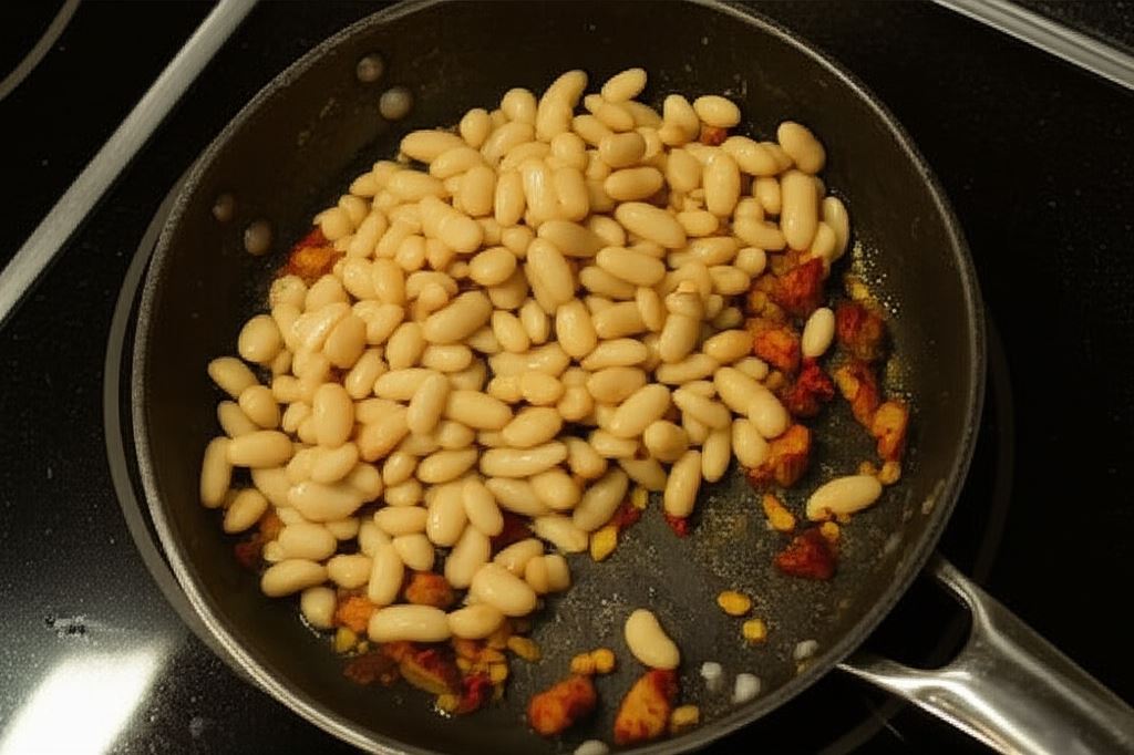Teraz wsyp koncentrat pomidorowy oraz odcedzoną fasolkę z puszki.