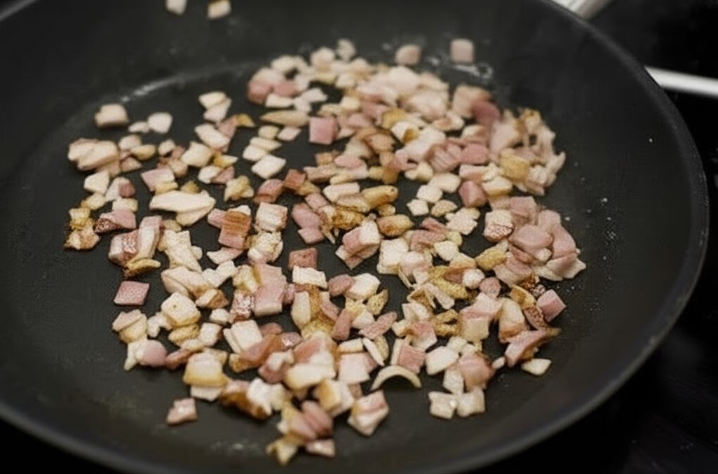 Boczek pokrój na drobne kawałeczki, przysmaż go starannie, aby uzyskać chrupiące skwarki. Odlej zbędny tłuszcz.