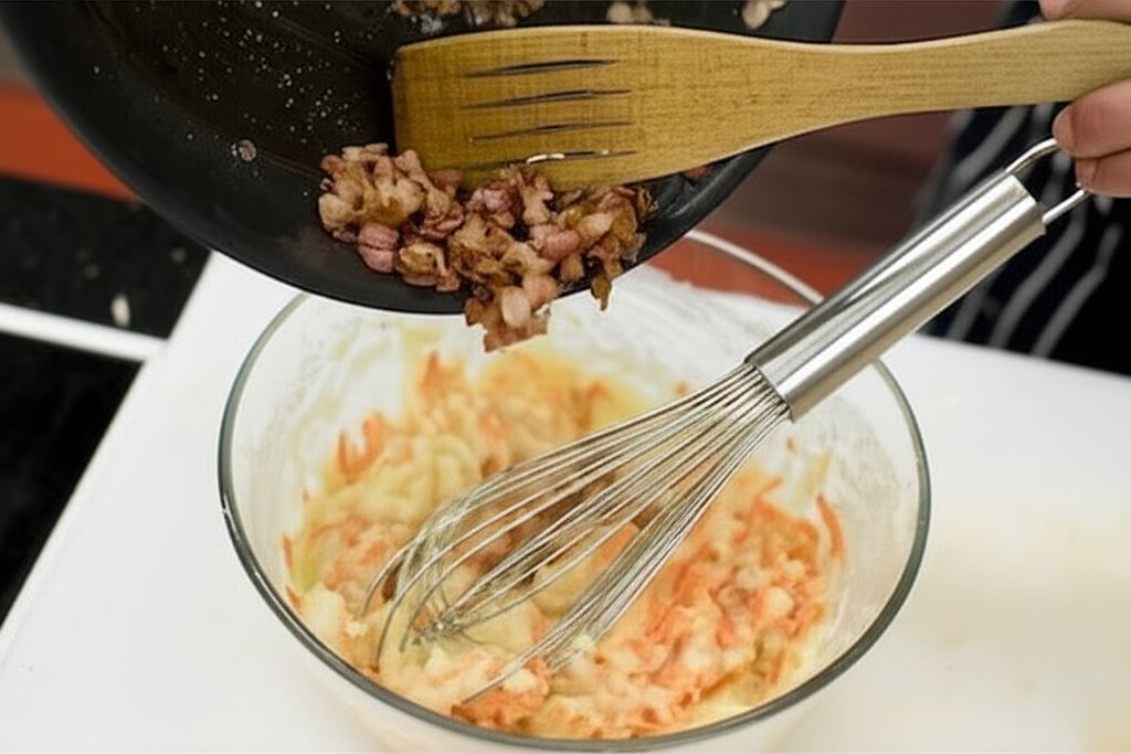 Dodaj do ciasta skwarki boczku oraz startą marchew. Wymieszaj wszystko dokładnie.