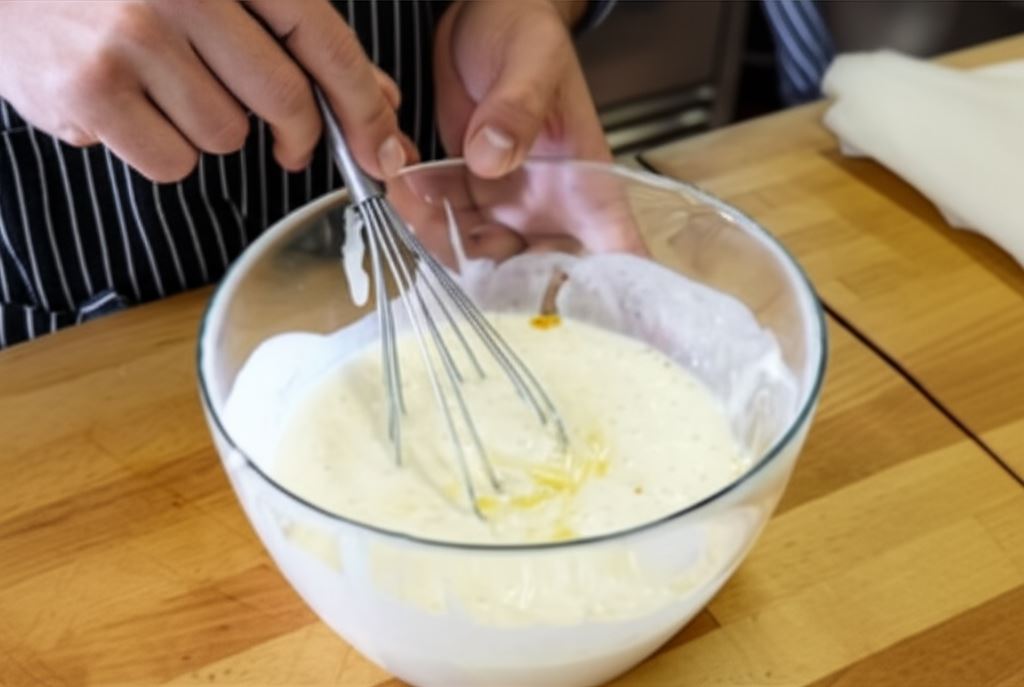 W naczyniu wymieszaj wszystkie składniki ciasta do uzyskania gładkiej masy, najlepiej używając trzepaczki lub miksera ręcznego.