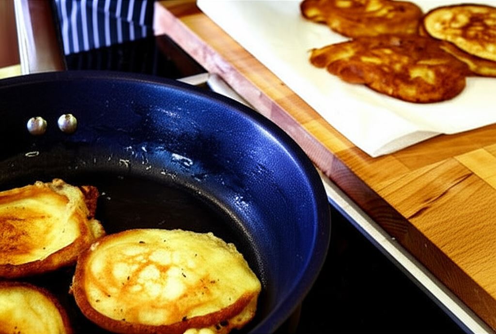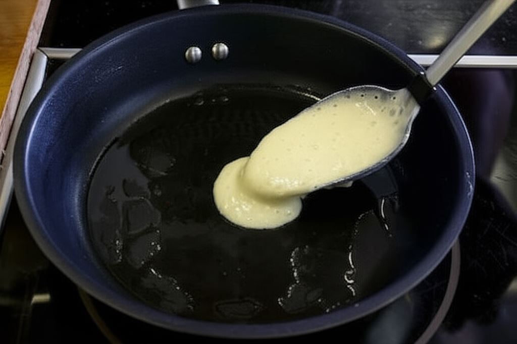Ciasto nakładaj łyżką na średnio nagrzaną patelnię z olejem do smażenia i niewielką ilością masła.