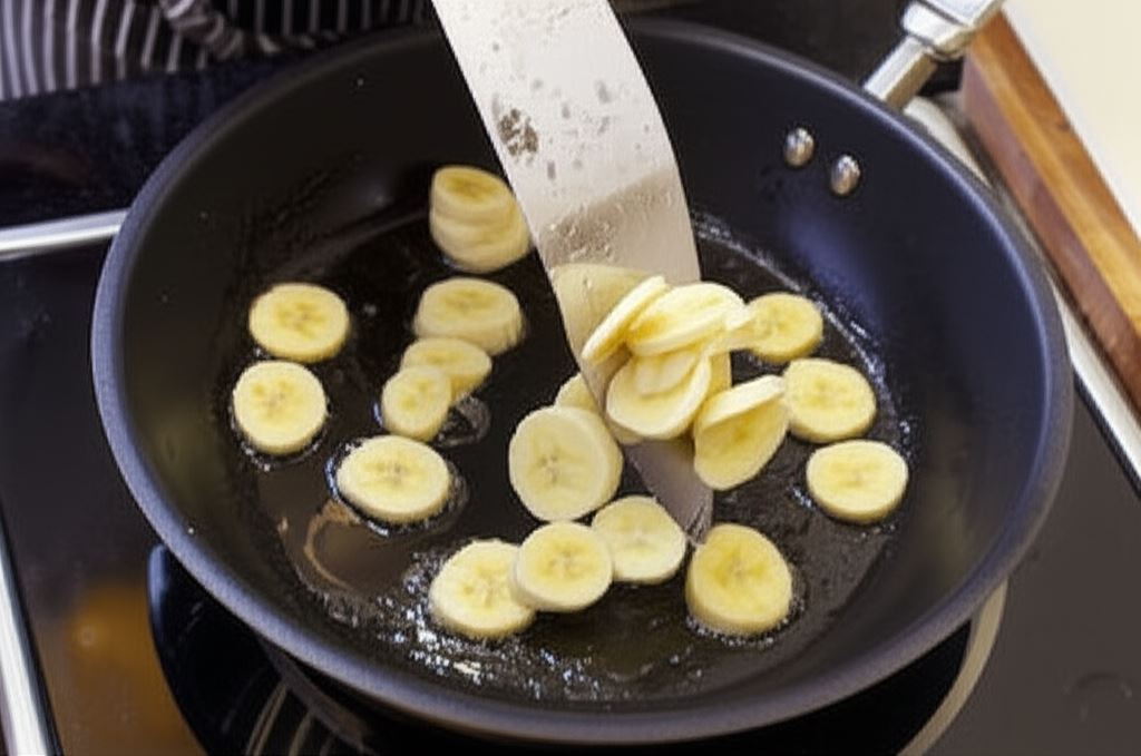Do tej samej patelni wsyp dwie łyżki masła i banana pokrojonego na plasterki.
