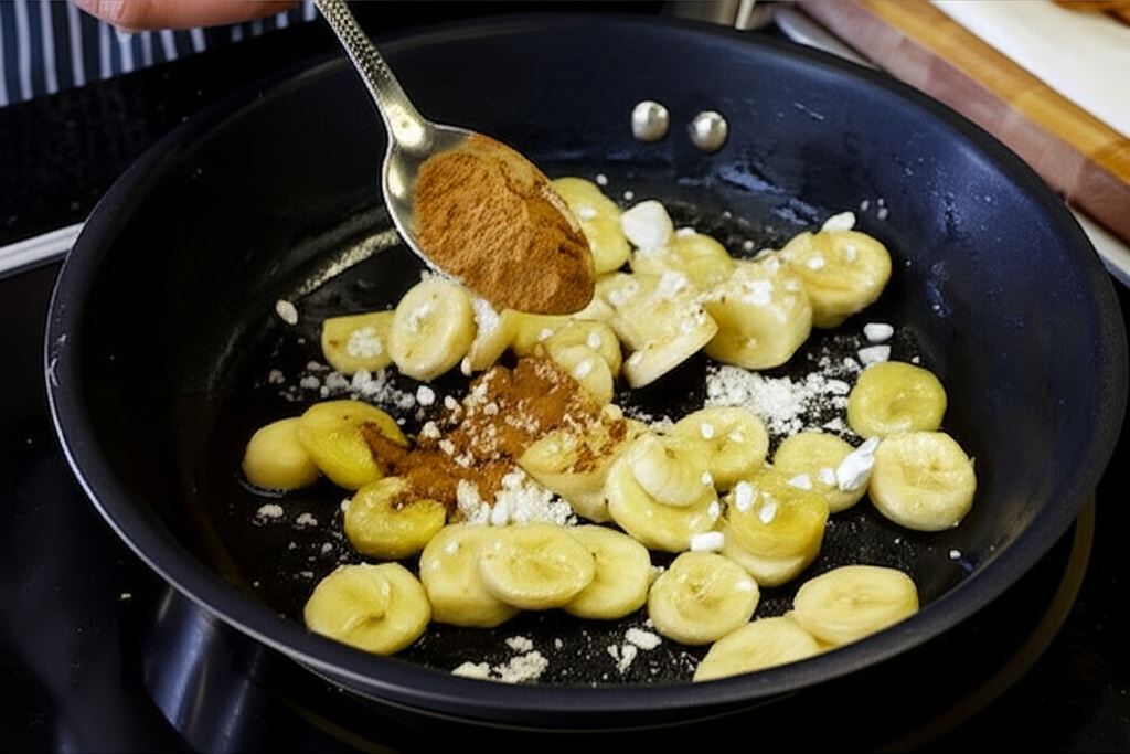 Dodaj Cynamon Knorr i cukier puder, a następnie mieszaj do momentu uzyskania sosu. Przygotowane placuszki polej cynamonowym sosem i przyozdób kawałkami bananów.