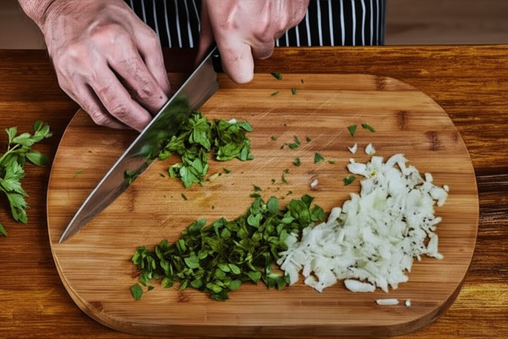 Cebulę obierz i drobno pokrój. Natkę pietruszki opłucz pod bieżącą wodą, lekko osusz i posiekaj.