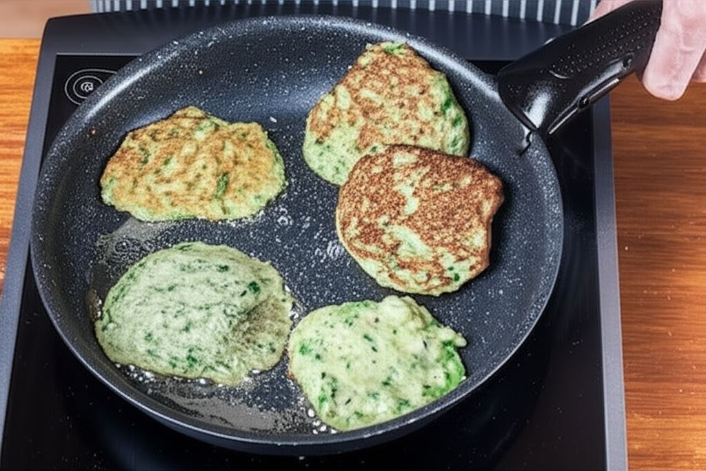 Rozgrzej patelnię na kuchence. Używając łyżki formuj okrągłe placki z cukinii i smaż je na małej ilości oliwy, aż delikatnie się zrumienią.