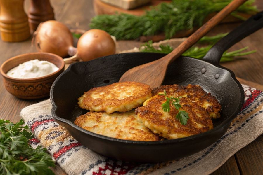 - Smażenie małych placków na rozgrzanym tłuszczu (tradycyjnie na smalcu)
