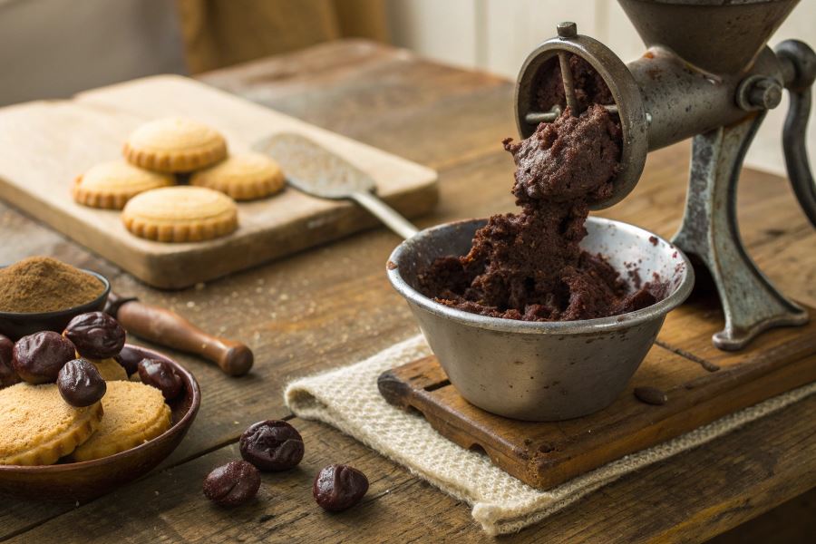 Technika mielenia ma kluczowe znaczenie – najlepiej przepuszczać składniki naprzemiennie (herbatniki, śliwki, herbatniki), co zapewni równomierne rozprowadzenie owoców w masie. Gotową masę formujemy w wałek i obtaczamy w wiórkach kokosowych, kakao lub siekanych orzechach.