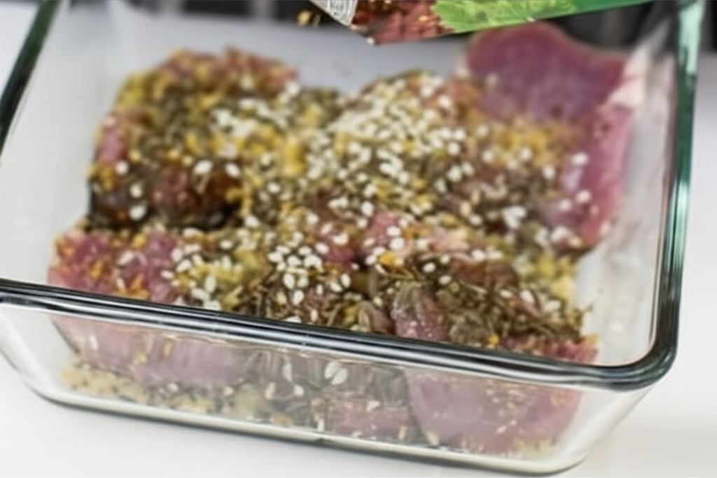 Potnij mięso na grube plastry. Potem zamarynuj w przyprawie Knorr, sosie sojowym, sezamie i tymianku.