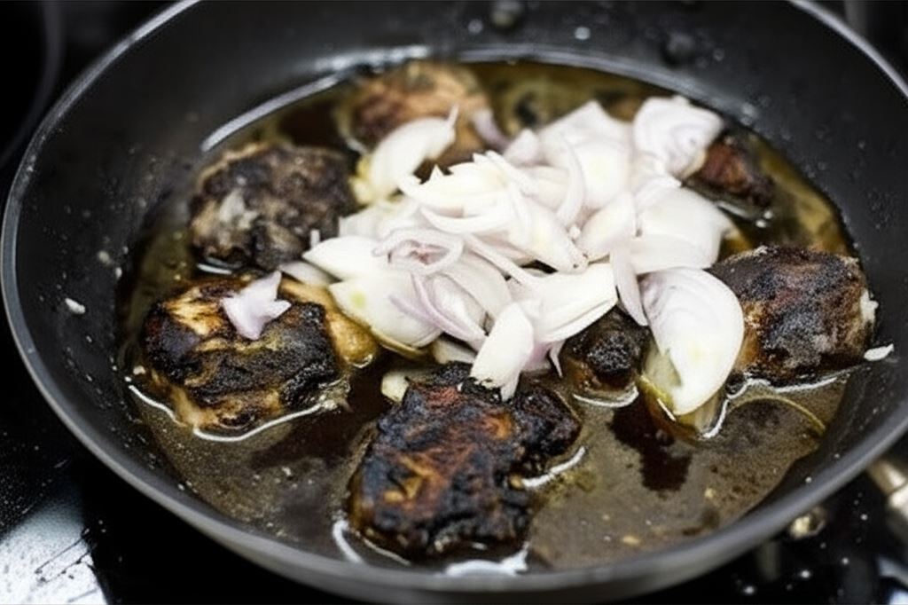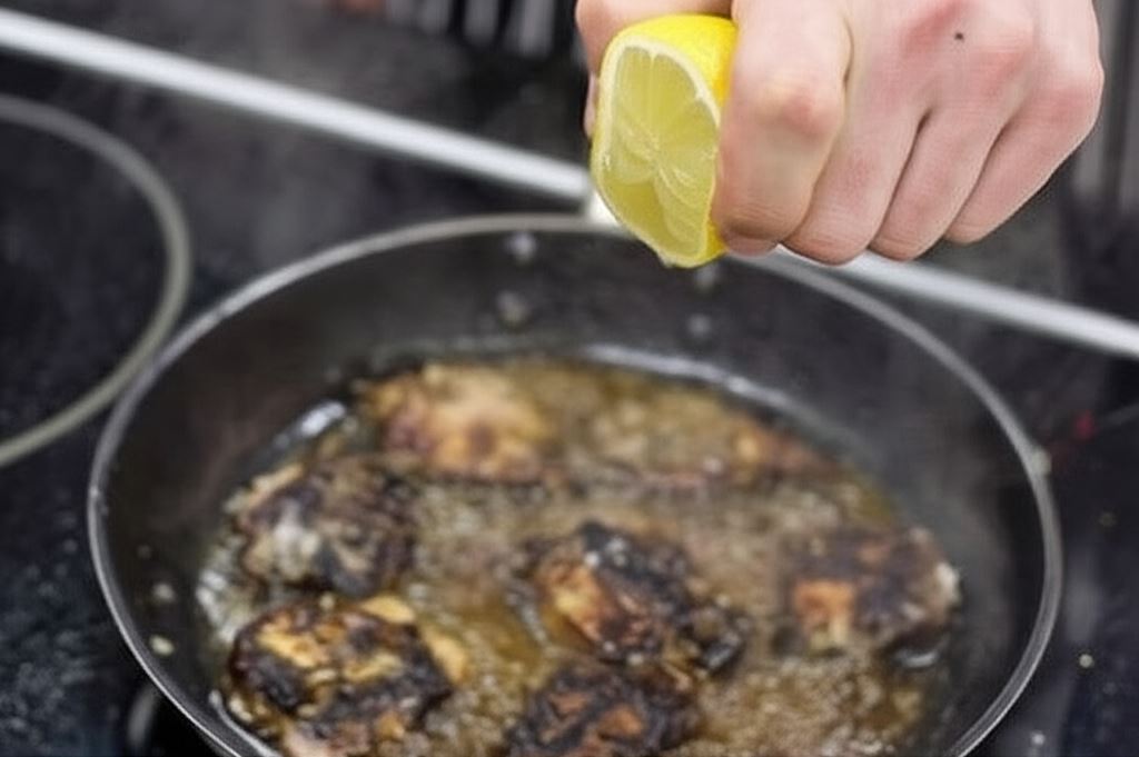Potem do patelni z mięsem dodaj resztę marynaty, sok z cytryny i pół szklanki wody.