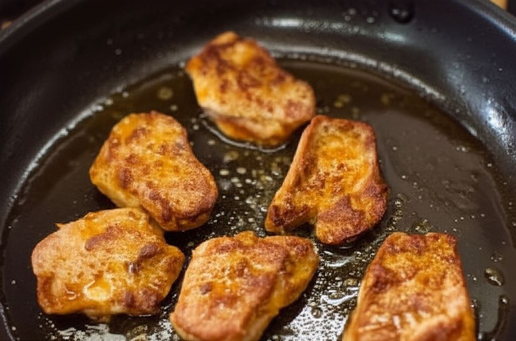 Polędwiczki zbaw z błonek, podziel na mniejsze części i oprósz przyprawą Knorr. Obsmaż na gorącej patelni z olejem, po obu stronach na złoty kolor.
