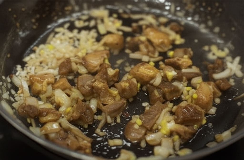 Na osobnej patelni zeszklij pokrojoną w kostkę cebulę. Potem dodaj rozmrożone grzyby pocięte na mniejsze kawałki. Smaż do momentu, aż płyn odparuje.