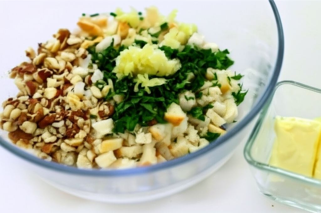 Ser pleśniowy, chleb tostowy bez skórki, orzechy włoskie i rozmaryn dokładnie posiekaj albo zblenduj aż powstanie jednolita masa.