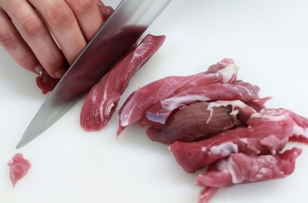 Mięso oczyść z błonek, opłucz, osusz. Pokrój na plastry o grubości 1 centymetra.