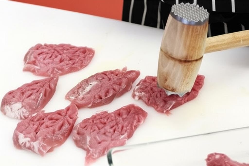 Kawałek mięsa umieść na plastikowej folii, nakryj drugim fragmentem foli, ubij na płaski placek. Mięso posyp pieprzem i szczyptą Przyprawy Knorr.