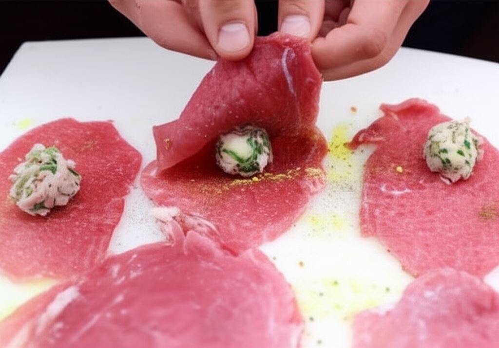 W centrum mięsa połóż kulkę farszu. Naciskając spowoduj, aby się spłaszczyła.
