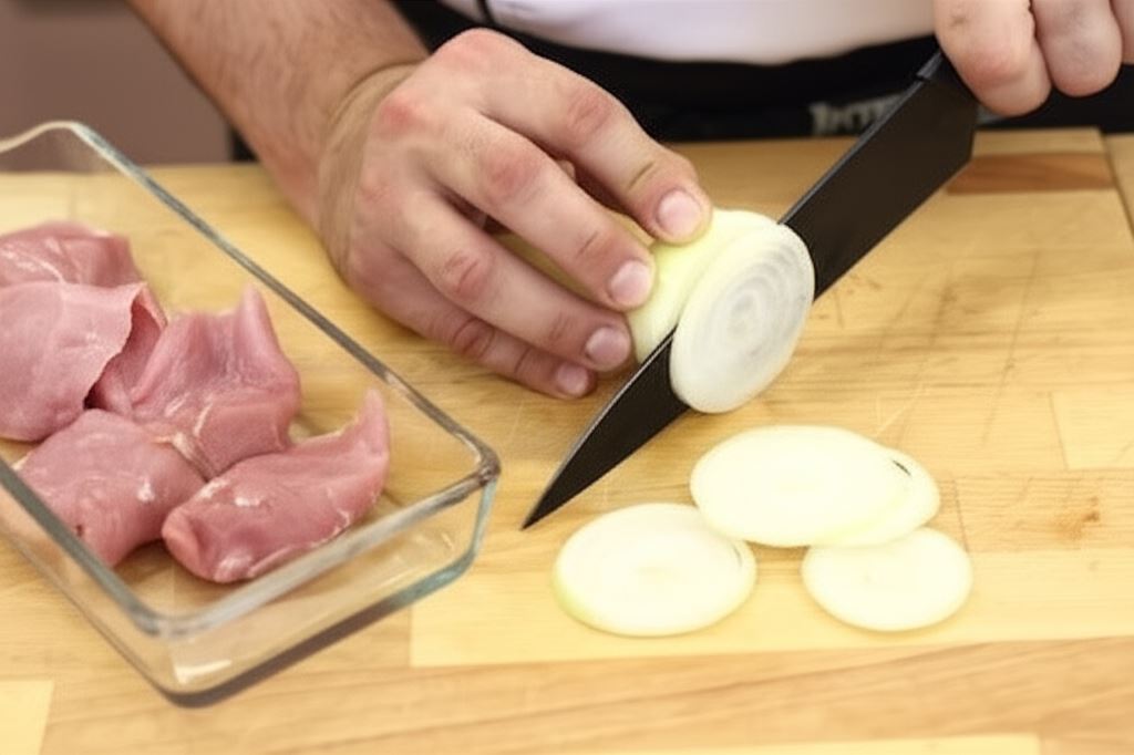 Mięso oczyść z błonek, pokrój skośnie na grube plastry, przypraw do smaku solą i pieprzem. Cebule pokrój w krążki.