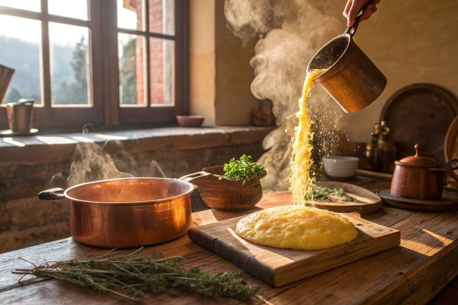 Sekret doskonałej polenty tkwi w cierpliwości i regularnym mieszaniu. Tradycyjnie używa się drewnianej łyżki, która nie przewodzi ciepła i pozwala na dokładne rozprowadzenie kaszy.
