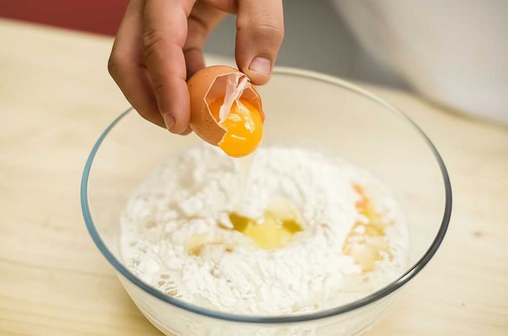 Sporządź ciasto na łazanki - wyrabiaj jednolite ciasto z mąki, jajek i odrobiny wody.