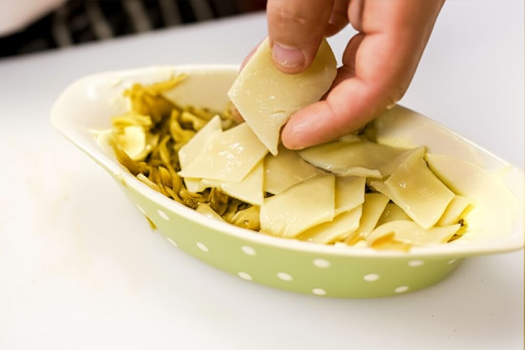 Ciasto rozwałkuj na cienko i zostaw na moment, aby przeschło. Potem wycinaj małe kwadratowe łazanki i ugotuj je w osolonej wrzącej wodzie. Odcedź.