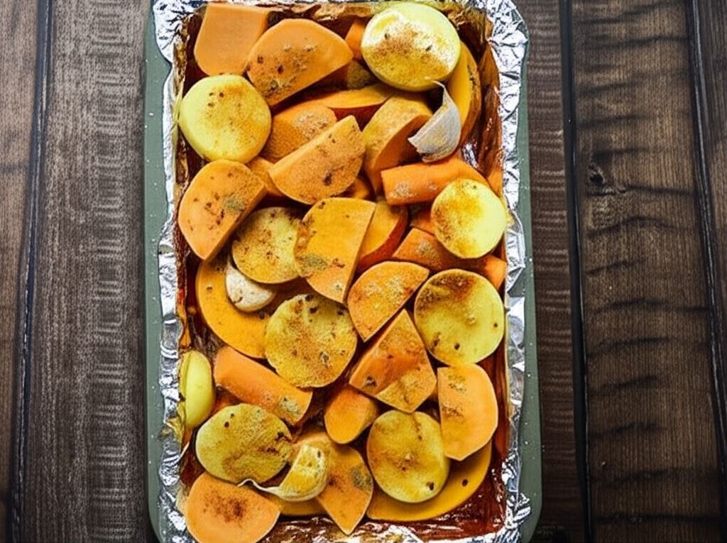 Obierz dynię ze skórki (w przypadku odmiany hokkaido piecz ze skórką), a także bataty, marchewkę i ziemniaki. Pokrój wszystko na mniejsze kawałki około 2-3 cm i umieść w naczyniu żaroodpornym. Dodaj zgniecione (lecz nieobrane) ząbki czosnku. Skrop warzywa olejem, wymieszaj rękami, a potem posyp 1 łyżeczką pikantnej przyprawy, wsyp 0,5 łyżeczki mielonej słodkiej papryki i 1 łyżeczkę mielonej kurkumy. Zamieszaj, nakryj folią spożywczą (wykonaj w niej kilka małych otworów, by para wodna mogła swobodnie uciec) i umieść na około 35-40 minut w piekarniku nagrzanym do 190 ºC.
