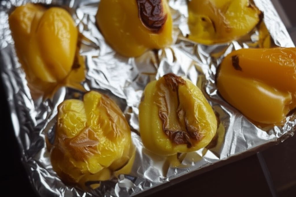 Paprykę opłucz, wysusz, przetnij na pół i wyciągnij nasiona. Na blasze do pieczenia rozłóż kawałek folii aluminiowej, a na niej umieść papryki. Jeżeli dysponujesz przestrzenią w piekarniku, piecz równocześnie z innymi warzywami – papryki umieść na górnej półce, skórka powinna wyraźnie się przypalić. Po około 10-15 minutach, gdy zauważysz, że skórka jest pomarszczona i przypalona, wyciągnij ją i ostrożnie przenieś do woreczka foliowego. Zamknij worek dokładnie i poczekaj około 10 minut aż ostygnie. W ten sposób papryka się zaparzy i łatwo zdejmiesz z niej skórkę. Oczyszczoną paprykę pokrój na drobniejsze części lub paski. Odłóż na później.