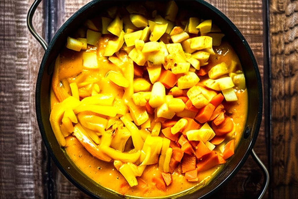 Rozgrzewające, aromatyczne curry w pięknym pomarańczowym kolorze to prawdziwa uczta dla zmysłów. Połączenie słodkiej dyni, batatów i marchewki z pikantną nutą przypraw tworzy harmonijną kompozycję smaków, która zachwyci każdego miłośnika kuchni roślinnej.