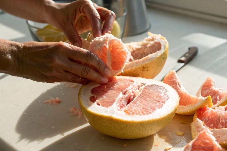 Kluczowym elementem jest usunięcie białej, gorzkiej błony otaczającej segmenty. Najskuteczniejszą metodą jest delikatne nacinanie błony wzdłuż naturalnych podziałów między segmentami, a następnie ostrożne ściąganie jej palcami. Błona ta zawiera związki nadające gorzki smak, dlatego jej dokładne usunięcie znacząco poprawia walory smakowe owocu.