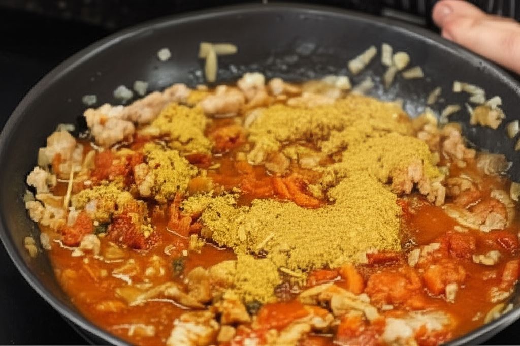 Do mięsa wsyp rozdrobnione pomidory konserwowe wraz z sokiem i Knorr Naturalnie smaczne - Spaghetti Bolognese. Całość zamieszaj i duś do momentu, aż porządnie zgęstnieje.