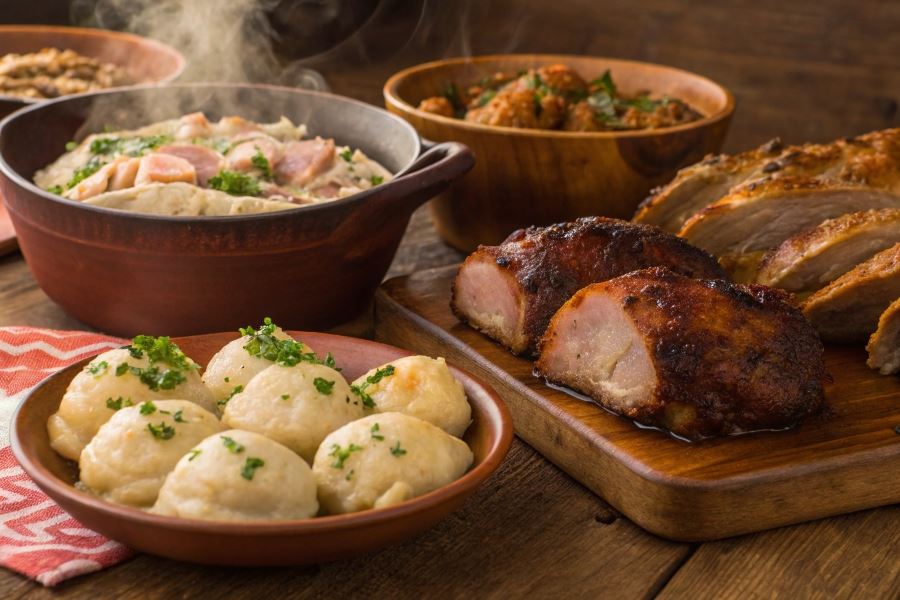 Polska kuchnia oferuje znacznie więcej niż tylko kotlet schabowy, gdy mowa o wieprzowinie. Golonka pieczona to prawdziwy klasyk – mięso z goleni wieprzowej, marynowane w ziołach i piwie, pieczone do uzyskania chrupiącej skórki i soczystego wnętrza. W Wielkopolsce popularne są pyzy z mięsem – puszyste kluski drożdżowe nadziewane mielonym mięsem wieprzowym z cebulą i przyprawami.