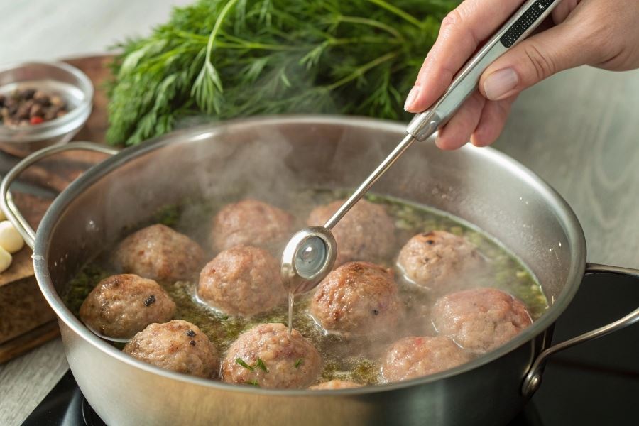 Temperatura wody podczas gotowania powinna wynosić 85-90°C – nie doprowadzaj do intensywnego wrzenia, gdyż może to powodować rozpadanie się pulpetów. Gotowanie w zupie wydłuża czas o około 2-3 minuty w porównaniu do gotowania w czystym wywarze, ze względu na gęstość płynu.
