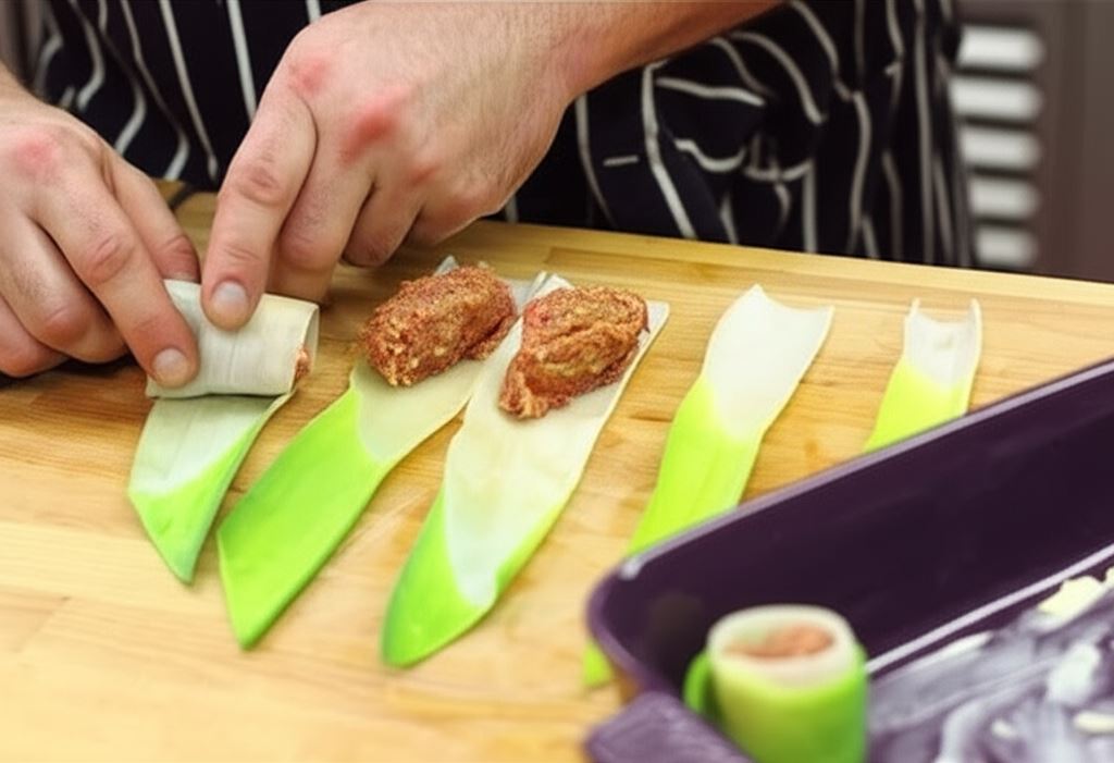 Porcje mięsa mielonego zawijaj w paski pora i umieszczaj w naczyniu żaroodpornym. Zapiekaj ok. 30 min w temperaturze 200 stopni C.