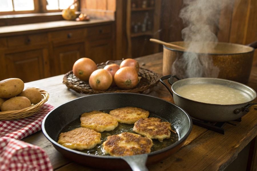 Placki ziemniaczane przygotowywane na bulionie ziemniaczanym to kulinarne dziedzictwo polskiej kuchni postnej, sięgające XVIII wieku, gdy ziemniaki stały się podstawą wyżywienia w trudnych ekonomicznie czasach. Pierwotnie placki wielkopostne były prostą potrawą przygotowywaną z tartych ziemniaków, mąki i wody, bez dodatku jaj czy tłuszczu zwierzęcego. Wykorzystanie bulionu ziemniaczanego zamiast wody stanowiło innowację, która znacząco wzbogacała smak dania, jednocześnie pozostając w zgodzie z postnym charakterem potrawy.