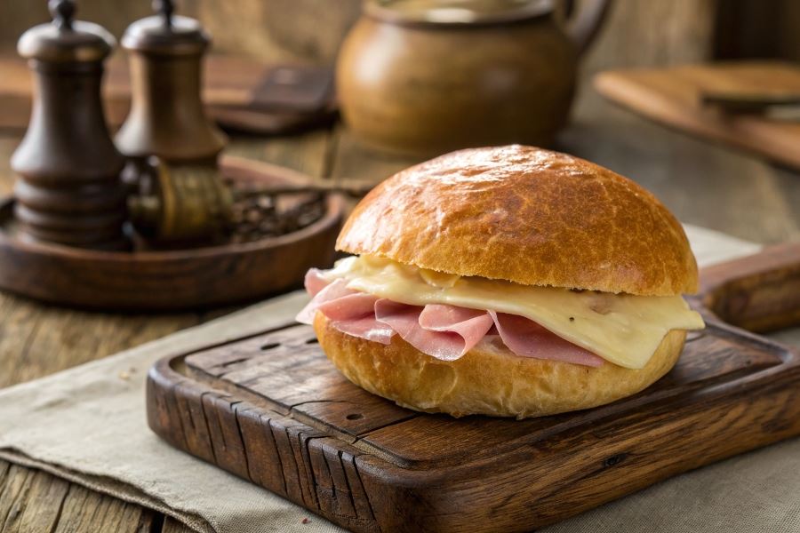 Przygotowanie i serwowanie bułki ziemniaczanej z szynką i serem