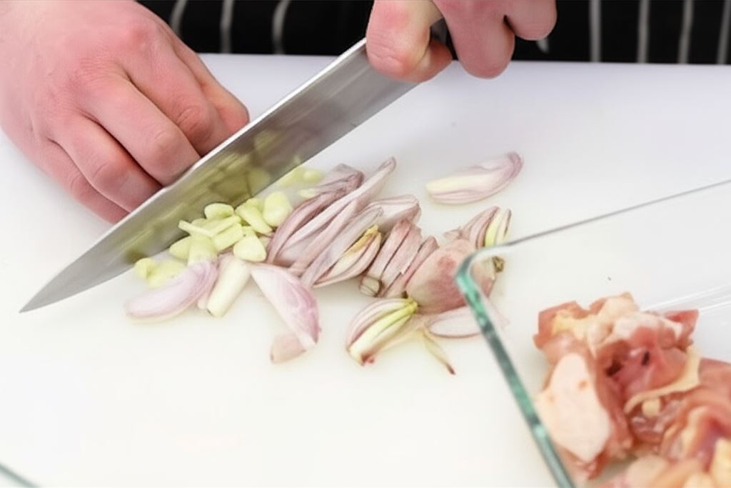 Mięso potnij w kostkę (2 centymetry na 2 centymetry), tak samo boczek, szalotkę w piórka, czosnek posiekaj, a namoczone grzyby pokrój w paski.