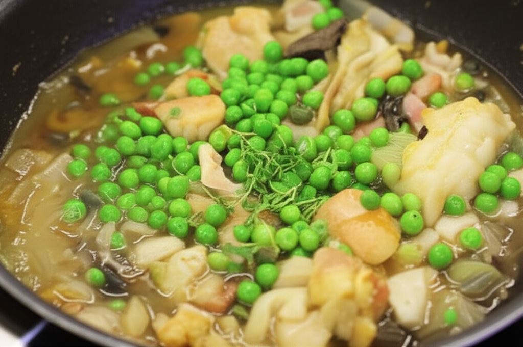 Gdy potrawka nieco zgęstnieje i mięso stanie się miękkie, dodaj groszek i listki świeżego tymianku. Całość zagotuj jeszcze raz. Serwuj z łyżką kwaśnej śmietany na wierzchu.