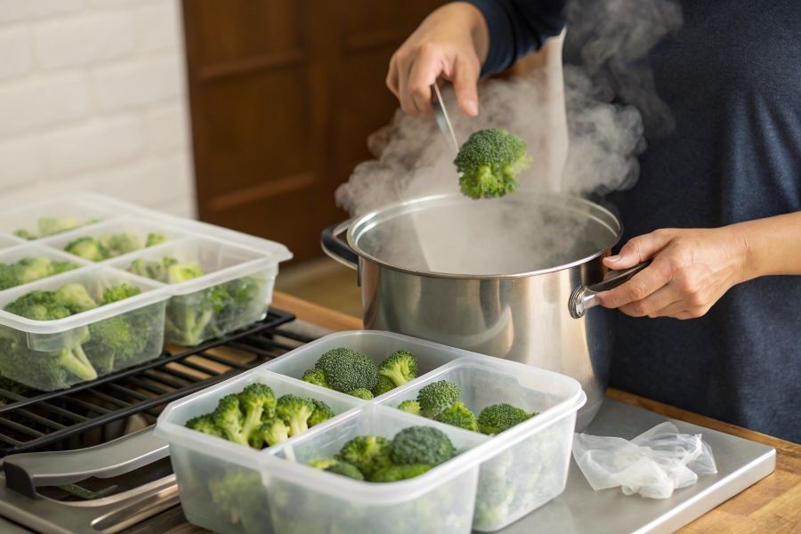 Prawidłowe blanszowanie brokułów: przygotuj garnek z wrzącą wodą i miskę z zimną wodą z kostkami lodu. Zanurz różyczki we wrzątku na 2-3 minuty (łodygi na 3-4 minuty), następnie natychmiast przenieś do lodowatej wody na taki sam czas. To zatrzyma proces gotowania i zachowa chrupkość.