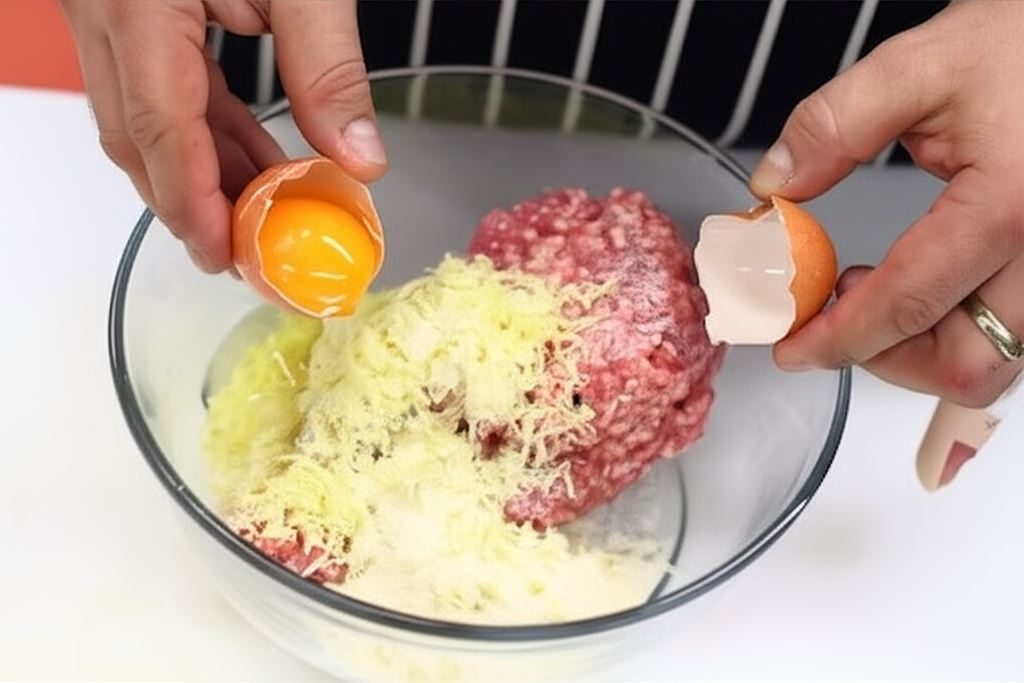 Mięso starannie połącz z jajkiem, parmezanem, semoliną i rozdrobnionym ząbkiem czosnku.