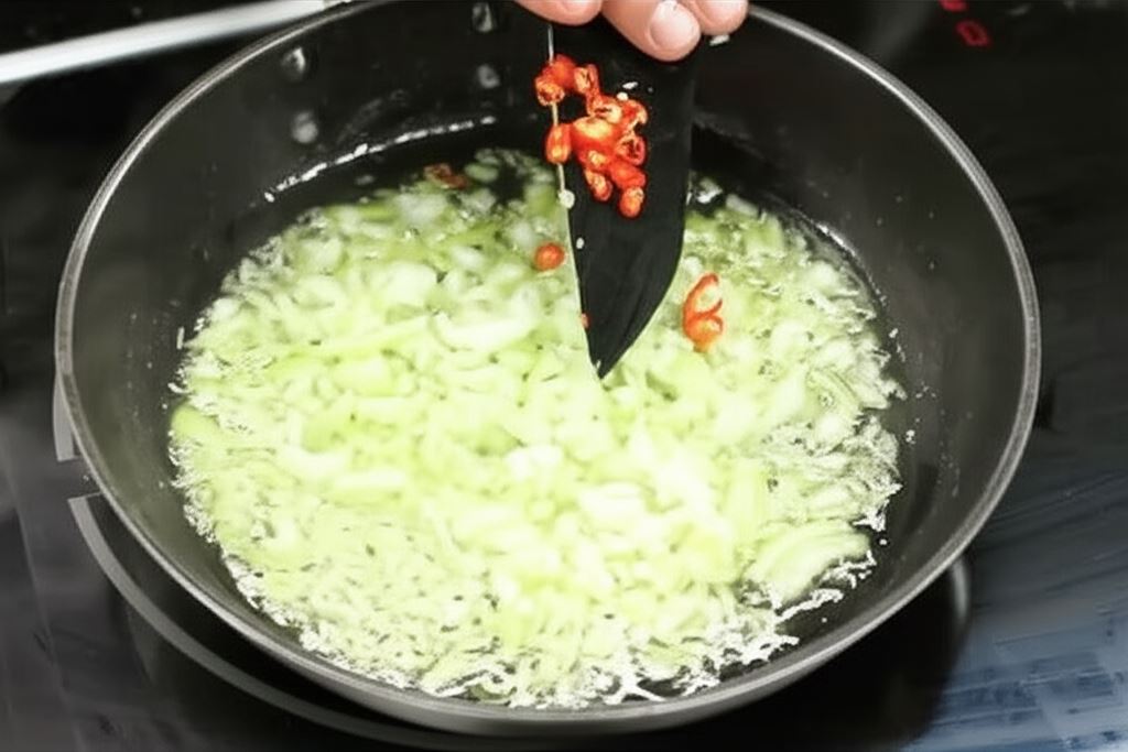 Przy użyciu miksera wymieszaj drugi ząbek czosnku, cebulę i oregano. Podsmaż kompozycję na nagrzanej patelni z oliwą z oliwek oraz masłem. Dodaj posiekaną papryczkę chili.
