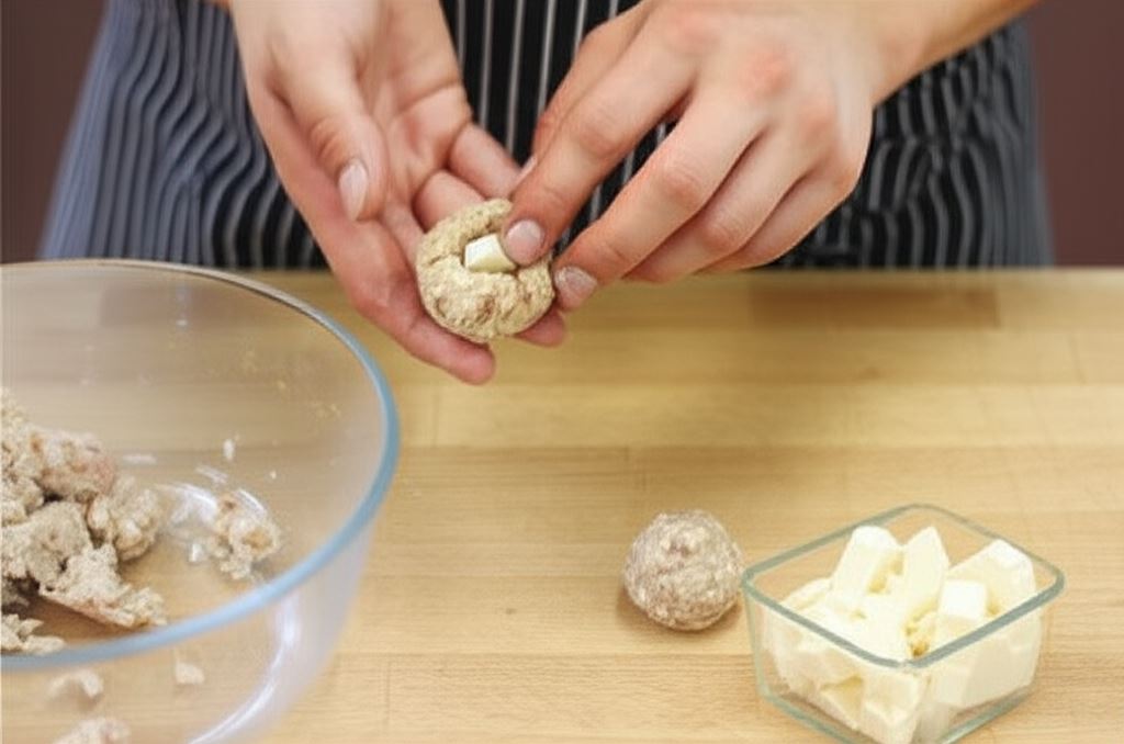 Po przyprawieniu mięsa rozdziel je na niewielkie porcje, każdą porcję uformuj w małą kulkę, którą następnie spłaszcz i w środek placuszka umieść kawałek sera brie. Całość ponownie zwiń formując z powrotem małą kulkę.