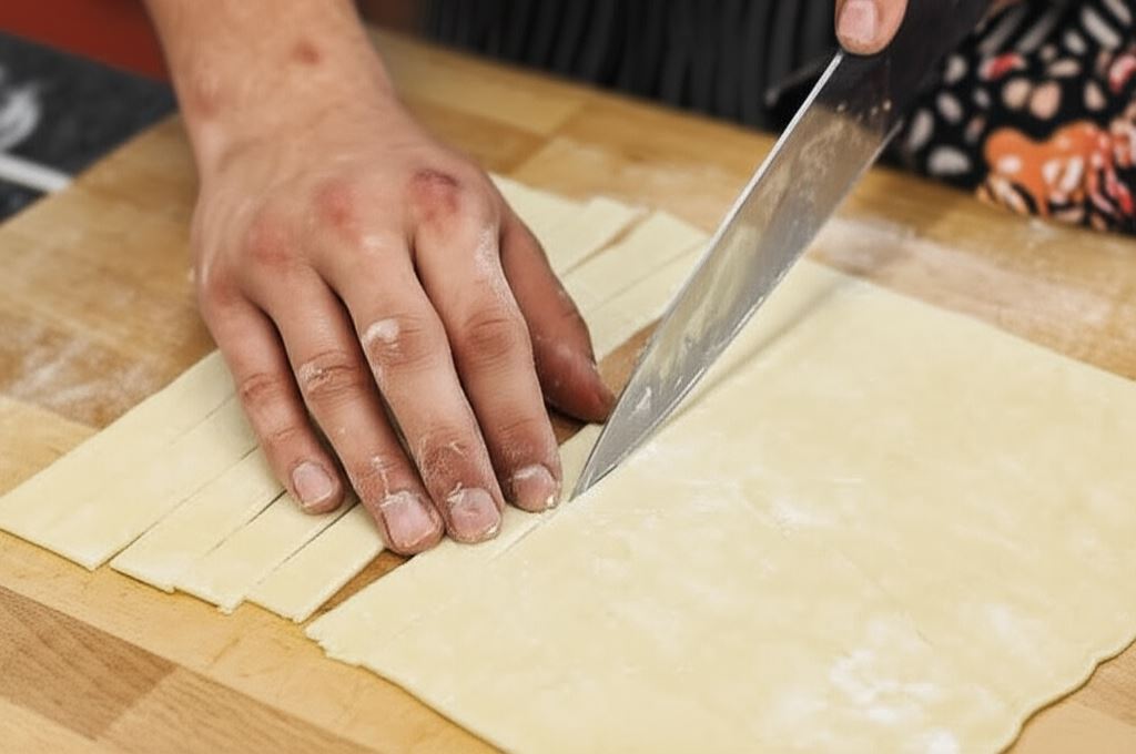 Na podsypanej mąką stolnicy rozwałkuj ciasto francuskie na grubość około 5 mm. Wytnij z ciasta paski o długości do 8 cm i szerokości do 2 cm. W każdy pasek owiń kulkę mięsną.