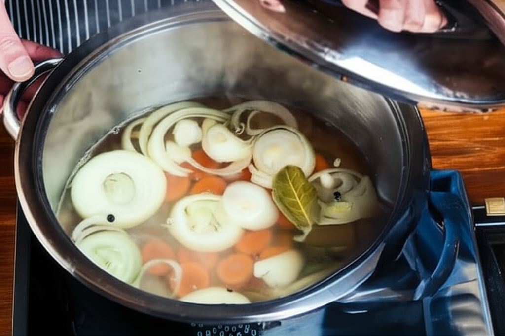 Do 2 litrów wrzącej wody wsyp 2 cebule pokrojone na plasterki, marchew pokrojoną w talarki, liść laurowy, ziele angielskie, wsyp łyżeczkę soli, 0,5 łyżeczki pieprzu, gotuj pod pokrywką na wolnym ogniu.