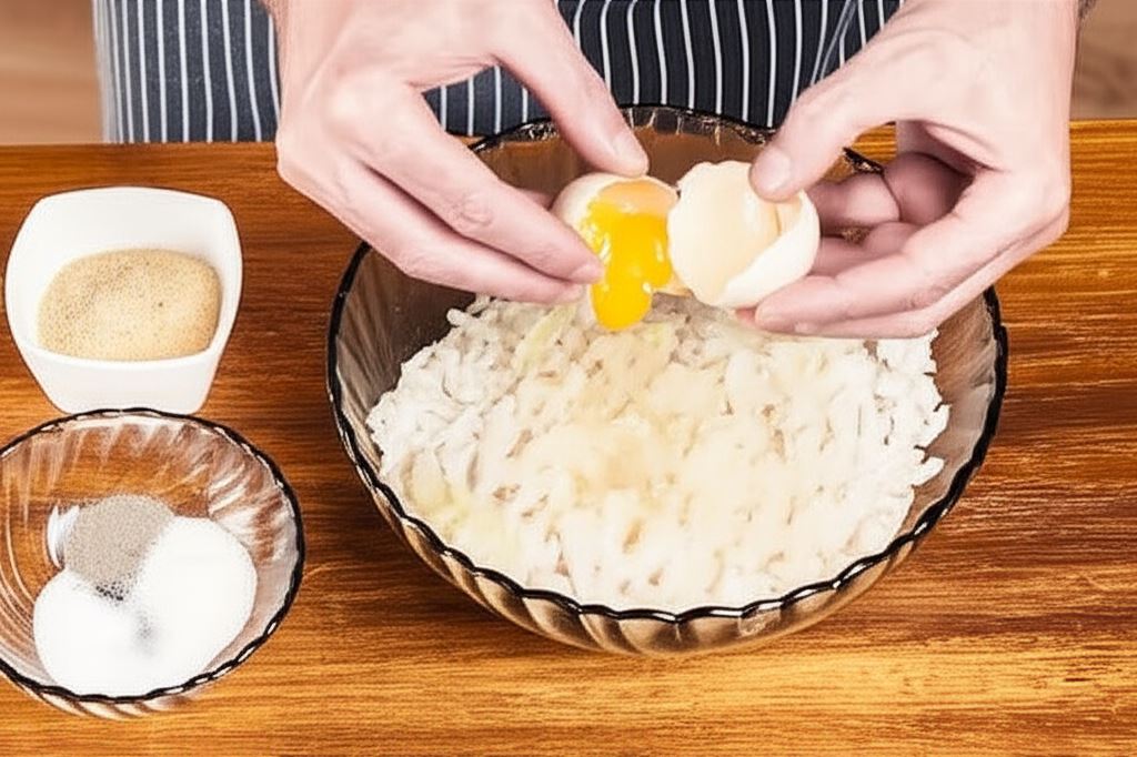 Umieść w misce, wsyp łyżeczkę soli, 0,5 łyżeczki pieprzu, 1 łyżeczkę cukru, bułkę tartą, jajko oraz 0,2 szklanki wody. Zagnieć masę.