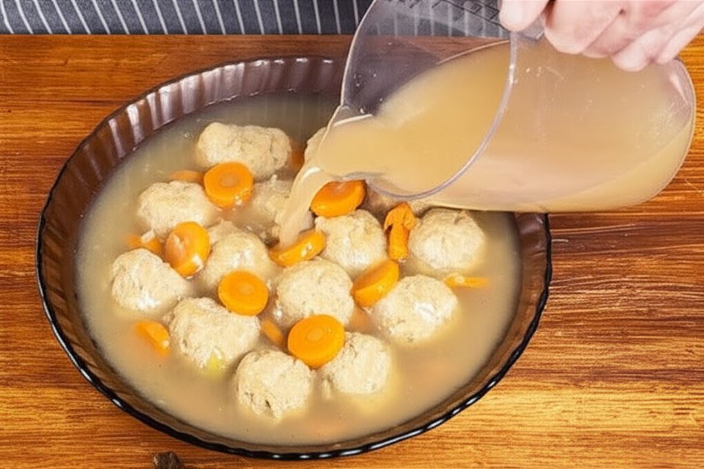 Uformuj klopsiki, wrzuć do bulionu, gotuj na wolnym ogniu ok. 45 minut. Odstaw z ognia, przypraw solą i pieprzem, ostudź. Klopsiki i marchewkę przenieś do miski.