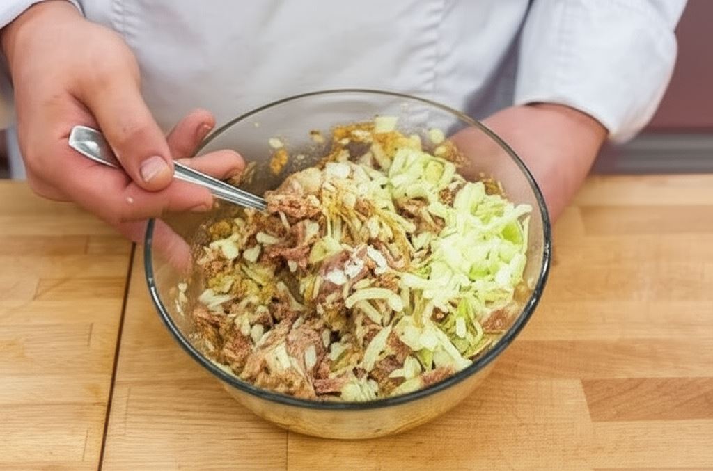 Wymieszany w 200 ml wody z ziemi Fix Knorr połącz z mielonym mięsem i drobno posiekaną kapustą. Całość dopraw do smaku niewielką ilością kuminu.